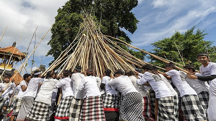 Prosesi dimulai dengan persembahyangan bersama di Pura Dalem yang dilanjutkan dengan pawai massal. Di setiap persimpangan jalan, para peserta akan menggabungkan tongkat kayu mereka hingga membentuk formasi kerucut atau piramida yang menjulang tinggi. Sambil berputar dan bersorak diiringi alunan gamelan, tradisi ini memancarkan semangat kebersamaan yang sangat kuat.